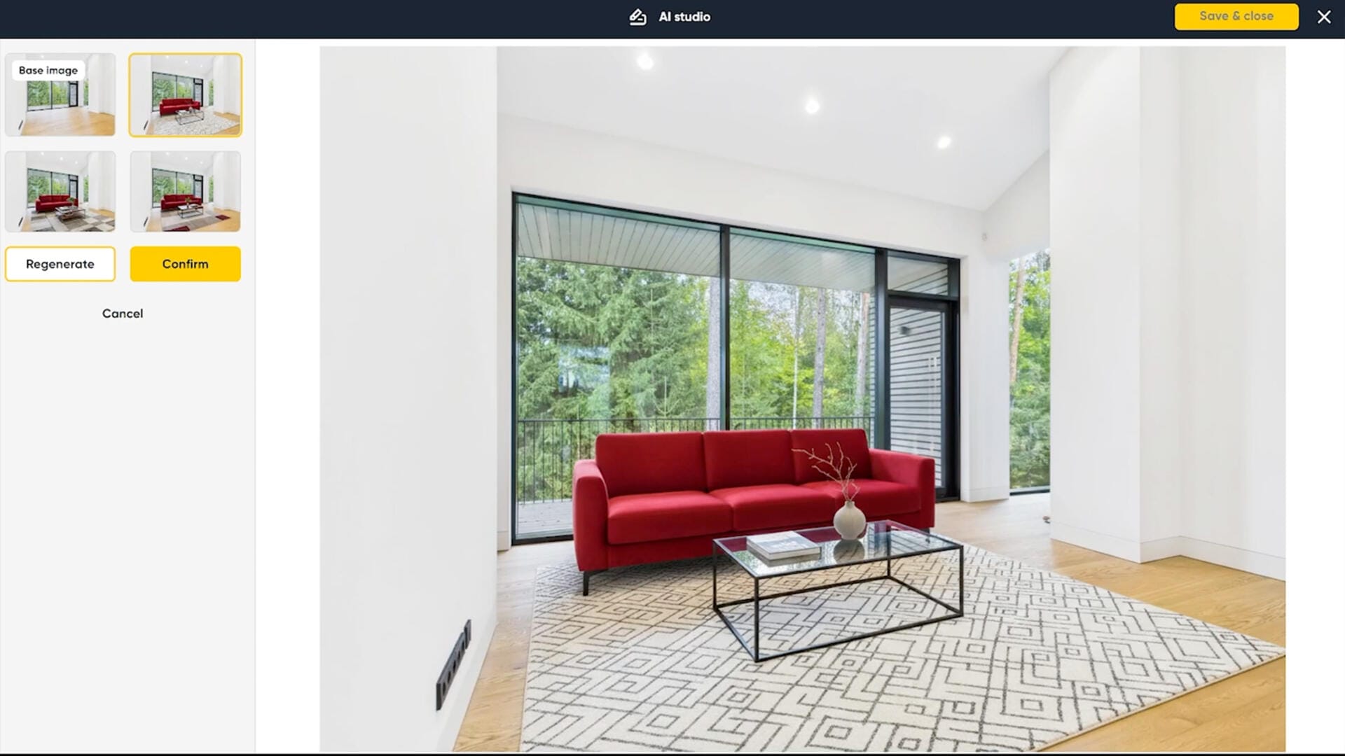 Capture once with the Giraffe PRO Camera. In Content Studio, you can AI enhance with virtual staging whenever you need it. Generate multiple furnished variations, restyle rooms, and iterate fast.
