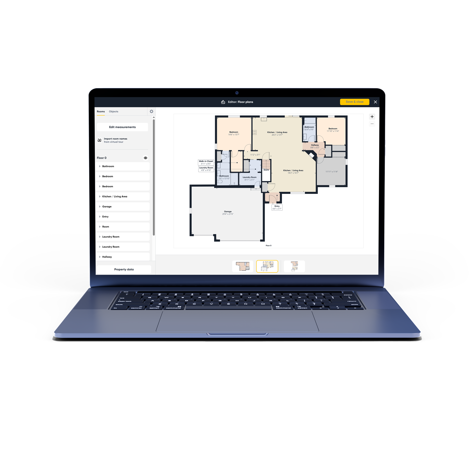 Rename rooms, tweak dimensions, apply labels and brand colors. Every change updates measurements and exports automatically—no CAD required.